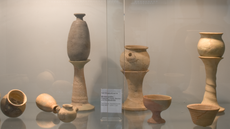 The Department of Near Eastern Archaeology at the Institute of Archaeological Sciences holds a collection of over 3,000 predominantly original objects from ancient Oriental cultures, mainly ceramics, bronzes, glass objects, and a large number of archaeological finds from northern Syria, due to its own excavations in the Near East, donations, and several extensive permanent loans from third parties. These finds, most of which have not yet been processed, offer a wide range of material for dissertations and research projects. They are also used in teaching, as they allow for direct observation, which is essential for archaeological training. A small part of the collection is on display in the institute's exhibition room in the IG Farben Building and can be viewed by appointment with the collection manager.