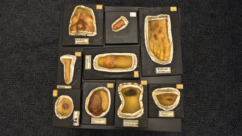 The University Dermatology Clinic has 228 moulages, the collection of which was started under the chairmanship of Karl Herxheimer (1861-1942). The oldest date back to 1904. They reflect a broad spectrum of dermatological conditions, with a particular focus on syphilis, skin tuberculosis, and skin tumors. Until Herxheimer's retirement, the collection was continuously expanded and a full-time moulageur (Ernst Winkler) was hired, who was responsible for most of the moulages still in existence today. At its peak, the collection comprised over 1,000 moulages, which were exhibited in a special room at the University Dermatology Clinic. Even today, the collection still contains several exhibits by some of Europe's most famous moulage artists, such as Jules Baretta (Paris), Alfons Kröner (Breslau), and Theodor Johnson (Freiburg).