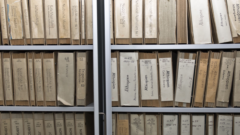 The historical negatives are mainly archived in a climate-controlled chamber, where expedition films (16mm originals and copies) are also stored. A large part of the images is accessible via an image database. An attached laboratory enables the execution of reproductive backup work on the original negatives, as well as the production of high-quality enlargements for exhibitions and the creation of image templates for publication projects.