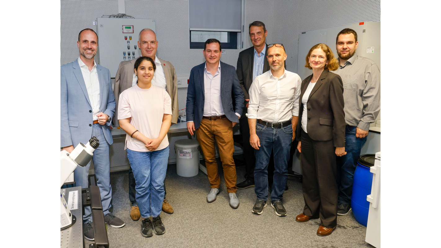 Wissenschaftsminister Clemens Hoch (l.), Prof. Dr. Georg Krausch (3.v.l.) und Prof. Dr. Stefan Müller-Stach (5.v.l.) mit Forschenden des Exzellenzprojekts CoM2Life, darunter dessen Sprecher, Prof. Dr. Andreas Walther (4.v.l.) (Foto: Stefan F. Sämmer)