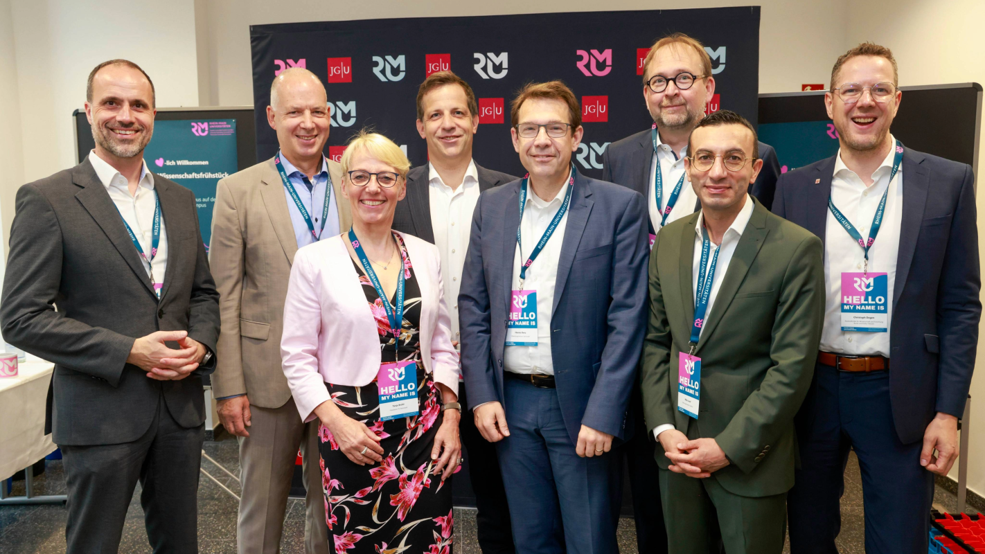 On 11 July 2025, the Rhine-Main Universities (RMU) welcomed representatives from politics, the media, the industry and civil society to the campus of Johannes Gutenberg University Mainz for a science breakfast. Twelve stakeholders from the Frankfurt Rhine-Main region participated in the event organized by the strategic alliance of the Rhine-Main Universities Goethe University Frankfurt, Johannes Gutenberg University Mainz and Technical University of Darmstadt – among them Clemens Hoch, State Minister for Science and Health in Rhineland-Palatinate, Christoph Degen, State Secretary for Science and Research, Arts and Culture in Hesse, as well as the mayors of Frankfurt, Darmstadt and Mainz. The representatives from politics, the industry, media and civil society met with members of the university boards and young RMU scientists to discuss current challenges faced by science.