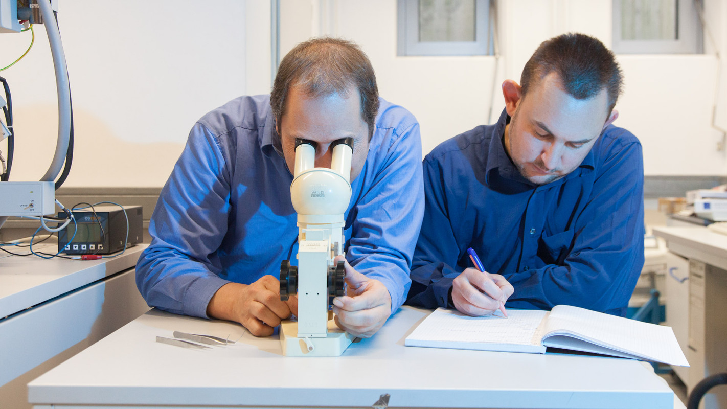 Professor Dr. Martin Ebert und PD Dr. Konrad Kandler bei der Voranalyse der Eiskeimproben. Bild: Chris Hartung