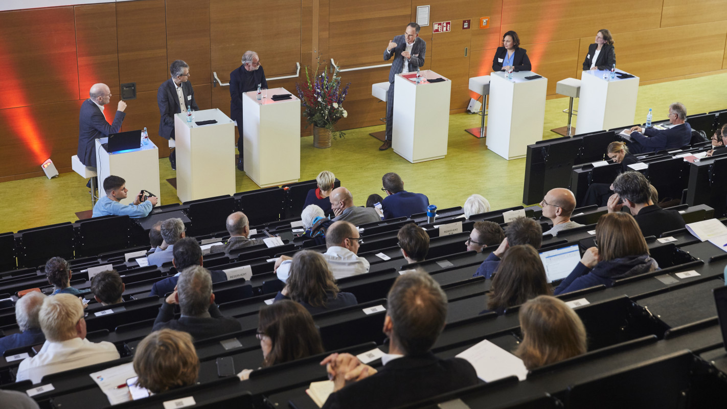 Den Auftakt der Veranstaltung bildete eine zweiteilige Podiumsdiskussion zum Thema „Die Wissenschaftsregion Rhein-Main gestalten: Rahmenbedingungen von Forschung, Innovationen und (Wissens-)Transfer“, die der Journalist Jan-Martin Wiarda moderierte. In der ersten Runde stellte Denis Alt, Staatssekretär im Rheinland-Pfälzischen Ministerium für Wissenschaft und Gesundheit, heraus: „Wissenstransfer in die Gesellschaft ist von besonderer Bedeutung, um generiertes Wissen in die Anwendung zu bringen und auch um Verständnis und Akzeptanz zu erhalten. Unser Alltagswissen reicht oft nicht mehr aus, um komplexe Situationen und Fragestellungen, wie etwa die Corona-Pandemie oder den Klimawandel, fundiert einschätzen zu können.“