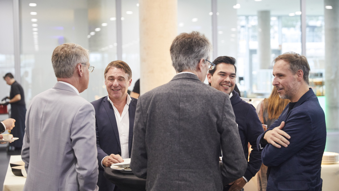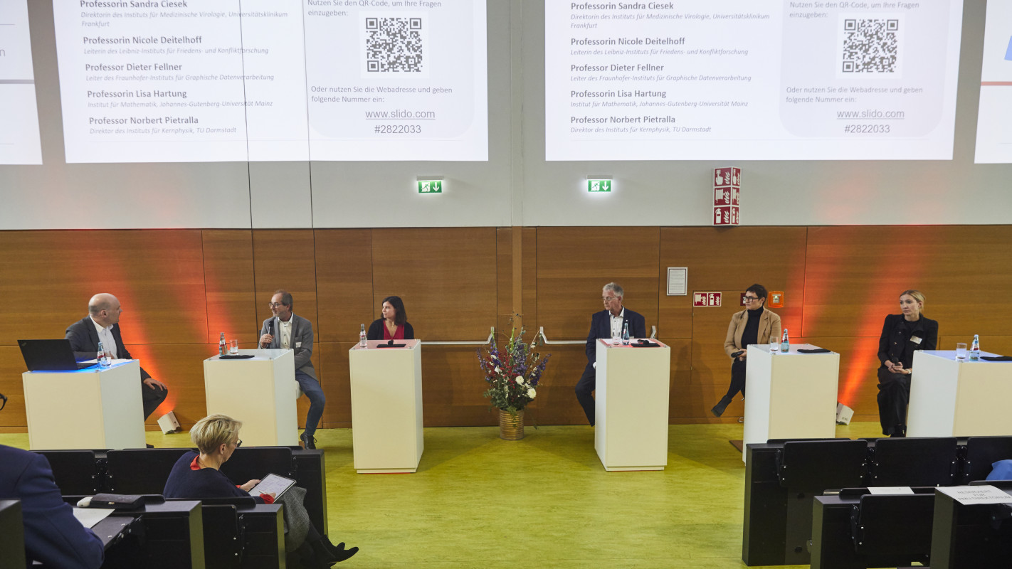 In der zweiten Diskussionsrunde widmeten sich zwei Mitglieder des neuen RMU-Beratungsgremiums „Partnership Board“, Nicole Deitelhoff, PRIF – Leibniz-Institut für Friedens- und Konfliktforschung Frankfurt und Dieter Fellner, Fraunhofer-Institut für Graphische Datenverarbeitung Darmstadt, zusammen mit drei renommierten Forschenden der RMU, Sandra Ciesek, Universitätsklinikum Frankfurt, Lisa Hartung, Fachbereich Mathematik der Johannes Gutenberg-Universität Mainz, und Norbert Pietralla, Direktor des Instituts für Kernphysik, TU Darmstadt, den Fragen, wie Kooperationsvorhaben angebahnt und auch langfristig erfolgreich durchgeführt werden können. Sie diskutierten, welche Vorteile eine starke Wissenschaftsregion den Forschenden bietet und wie die regionale Zusammenarbeit aus ihrer Sicht weiterentwickelt und ausgebaut werden kann.