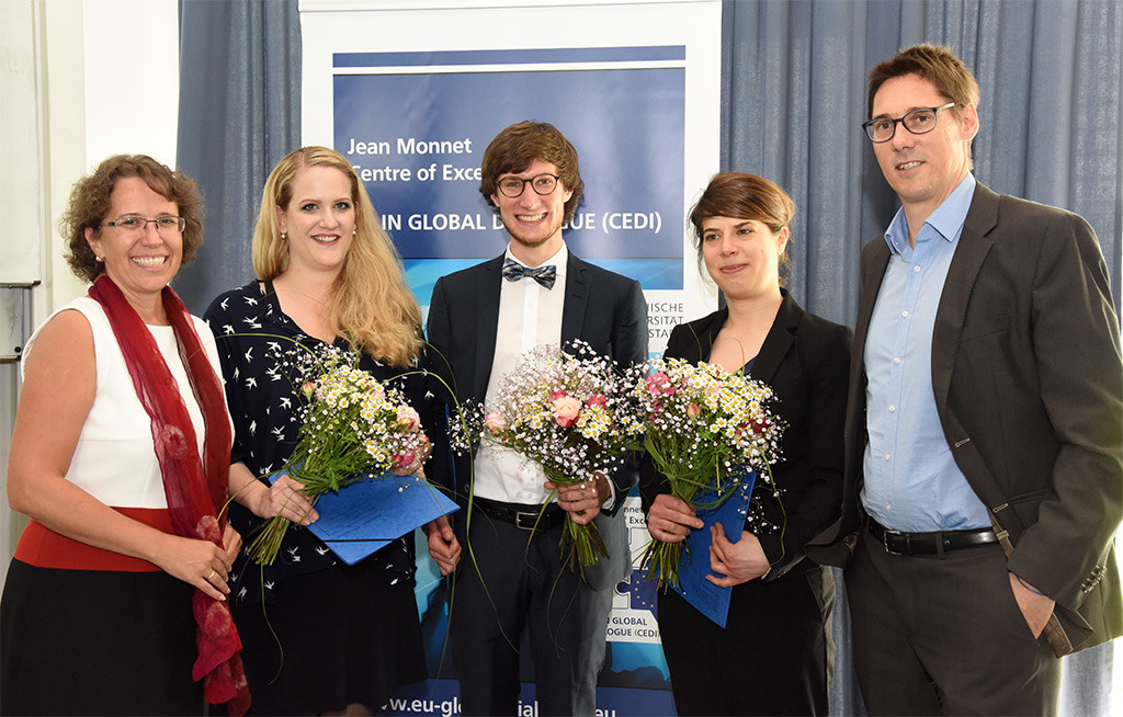 Im Rahmen der Annual Lecture des Jean Monnet Centre of Excellence "EU in Global Dialogue" (CEDI) wurden am 1. Juli 2016 drei Studierende der Johannes Gutenberg-Universität Mainz und der TU Darmstadt mit dem Jean Monnet Award on EU in Global Dialogue" geehrt. Damit zeichnet CEDI herausragende Abschlussarbeiten aus.