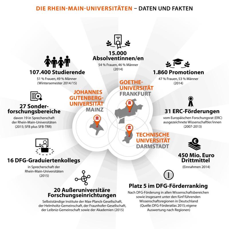 Das Rhein-Main-Gebiet positioniert sich mit den Rhein-Main-Universitäten als leistungsstarker Wissenschaftsstandort. Mit rund 107.400 Studierenden, 1.440 Professuren und aktuell mehr als 70 Kooperationen sind die drei Universitäten die zentralen Akteure der Wissenschaftsregion Rhein-Main. Nach den Zahlen des jüngsten Förderatlas der Deutschen Forschungsgemeinschaft (DFG) gehören die drei Rhein-Main-Universitäten gemeinsam hinsichtlich ihrer Drittmitteleinwerbung in den zentralen Wissenschaftsbereichen sowie hinsichtlich der gesamten Drittmitteleinwerbung von über 450 Millionen Euro pro Jahr zu den fünf führenden Wissenschaftsregionen Deutschlands.
