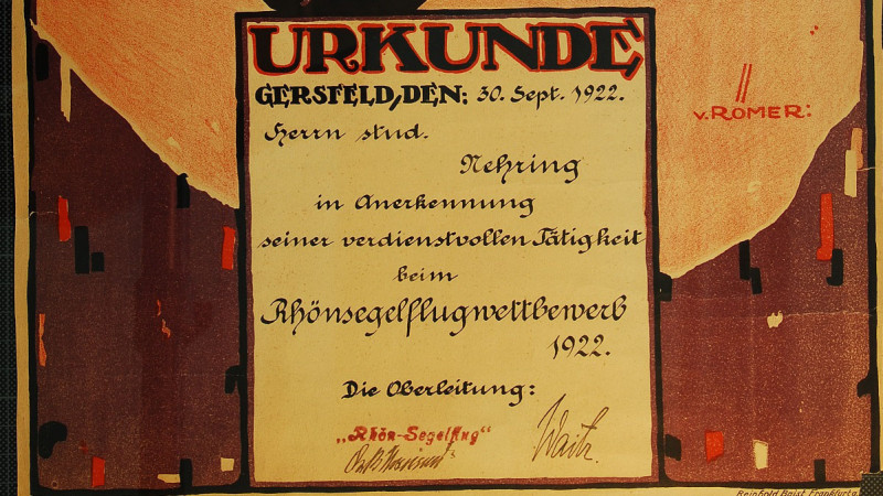 Urkunde vom Rhön-Segelflugwettbewerb 1922 für den erfolgreichen Segelflieger Johannes Nehring, Student der TH Darmstadt. Bild: Nasser Amini